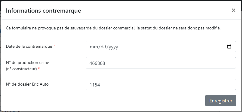 - Saisir date de CTM, N° usine & N° Eric Auto