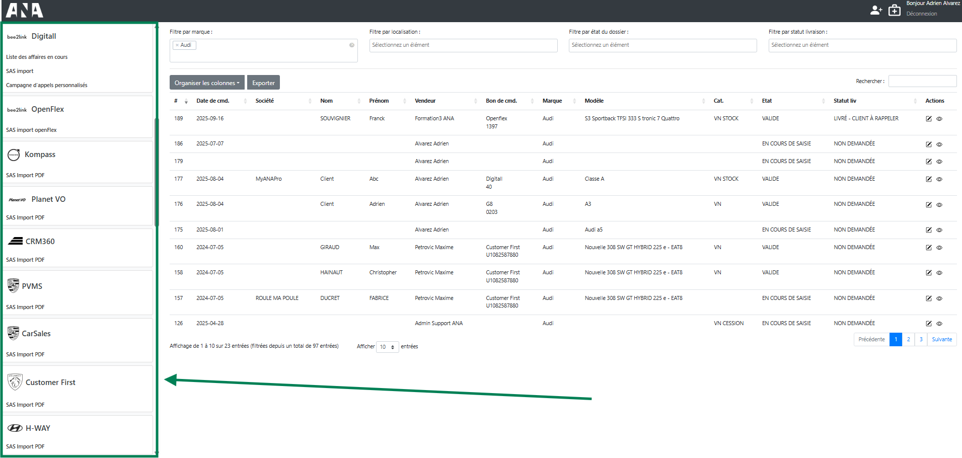 Avant tout, il faut savoir que pour pouvoir consulter vos dossiers commerciaux, il est nécessaire de les importer via le SAS Import situé dans votre menu de gauche (par exemple en cliquant sur OPENFLEX ou DIGITALL).