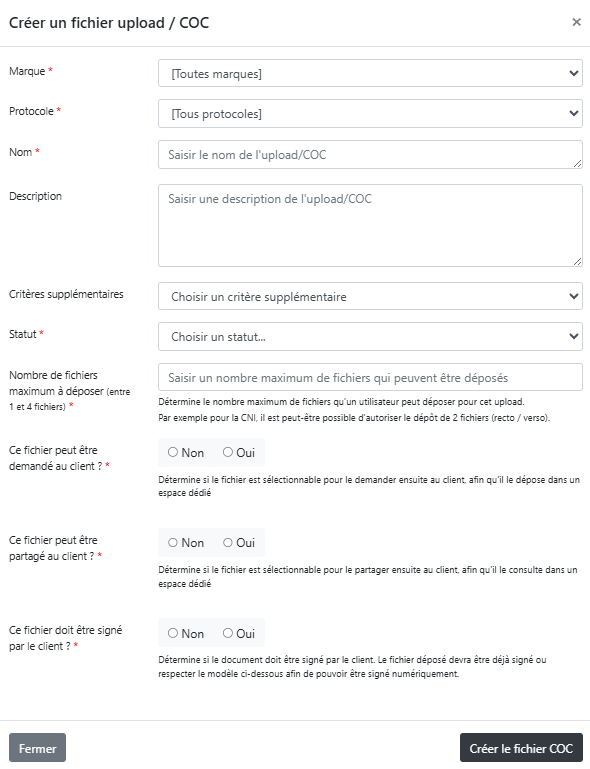 Pour modifier un upload/COC (le supprimer, en ajouter un nouveau ou le renommer), il est impératif de disposer du rôle administrateur. Sans ce rôle, aucune modification ne pourra être effectuée.