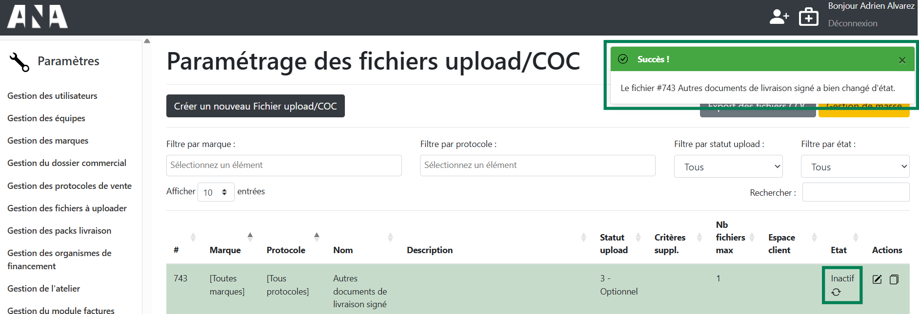 Cliquez sur l’état « Actif » pour le passer en « Inactif », et inversement.