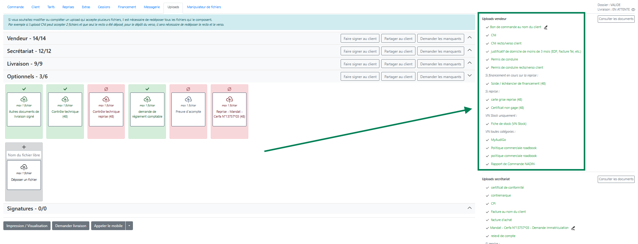 ⚠️ Note : Le simple fait de voir l’upload en vert confirme que le document est bien présent. Pour l’ouvrir, il faut impérativement cliquer sur la ligne correspondante tout à fait à droite.